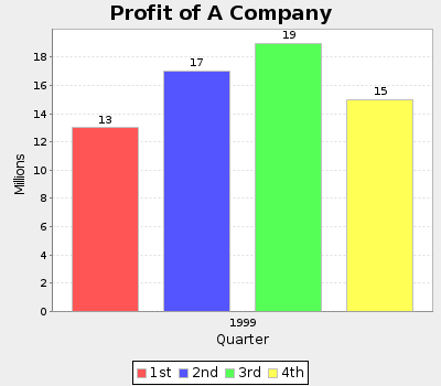 What was the average quarter profit in millions during 1999? 14. All the customers to the restaurant ordered either hamburgers or fries or both in some day. 39 customers ordered hamburgers, 38 ordered fries, and 14 ordered both. What was the total number of customers in the day to the restaurant? 15. If 10 × = 9, what is the value of 135 × ? 16. If 2m = 4, what is the value of 6m − 7? 17. M is a set of numbers whose median is 4. N is a set that is generated by tripling each number in M. What is the median of the numbers in set N? 18. After a holiday season, a department store gave a 40% discount on the suits which were less than $60, while gave a 45% discount on the suits which were $60 or more. What is the price (in dollars) after discount if a suit was $105 originally? 19. The average age of 6 people is 25. None of them are younger than 14 years old. How old is the oldest possible age in the group? 20. How many two-digit numbers are there in which the tens digit is greater than the ones digit? |