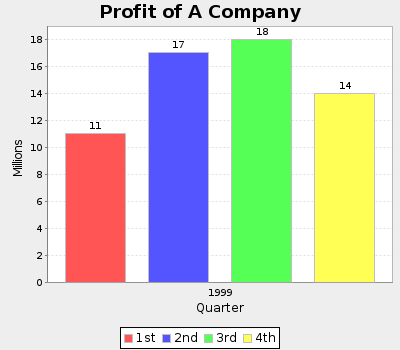 What was the average quarter profit in millions during 1999? 14. All the customers to the restaurant ordered either hamburgers or fries or both in some day. 41 customers ordered hamburgers, 35 ordered fries, and 28 ordered both. What was the total number of customers in the day to the restaurant? 15. If 8 × = 9, what is the value of 90 × ? 16. If 5m = 8, what is the value of 10m − 14? 17. M is a set of numbers whose median is 1. N is a set that is generated by tripling each number in M. What is the median of the numbers in set N? 18. After a holiday season, a department store gave a 35% discount on the suits which were less than $90, while gave a 40% discount on the suits which were $90 or more. What is the price (in dollars) after discount if a suit was $135 originally? 19. The average age of 8 people is 23. None of them are younger than 15 years old. How old is the oldest possible age in the group? 20. How many two-digit numbers are there in which the tens digit is less than the ones digit? |